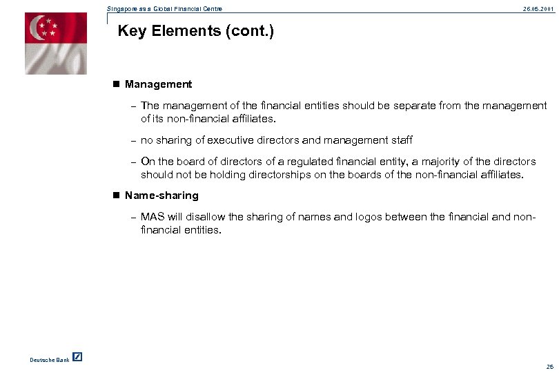 Singapore as a Global Financial Centre 26. 05. 2001 Key Elements (cont. ) n Management – The management of the financial entities should be separate from the management of its non-financial affiliates. – no sharing of executive directors and management staff – On the board of directors of a regulated financial entity, a majority of the directors should not be holding directorships on the boards of the non-financial affiliates. n Name-sharing – MAS will disallow the sharing of names and logos between the financial and nonfinancial entities. Deutsche Bank 25