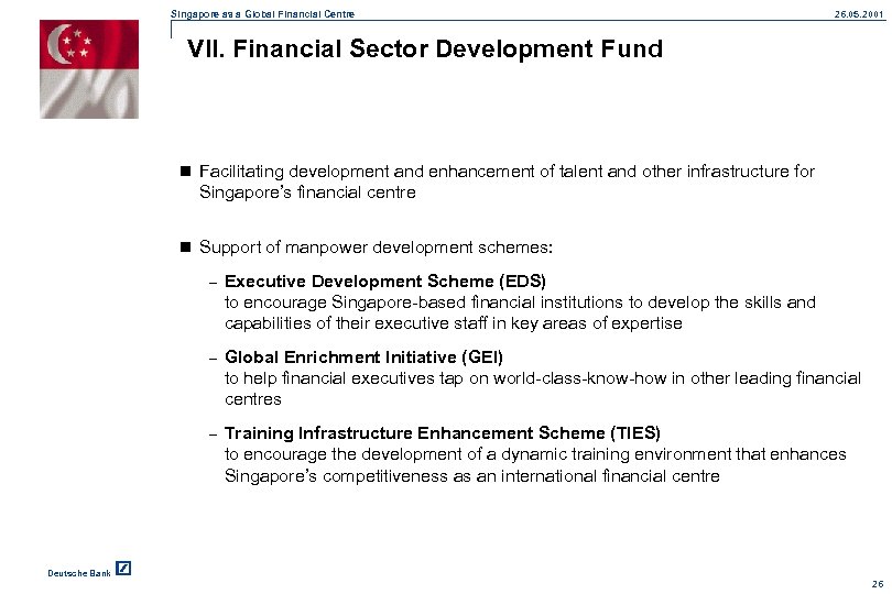 Singapore as a Global Financial Centre 26. 05. 2001 VII. Financial Sector Development Fund n Facilitating development and enhancement of talent and other infrastructure for Singapore’s financial centre n Support of manpower development schemes: – Executive Development Scheme (EDS) to encourage Singapore-based financial institutions to develop the skills and capabilities of their executive staff in key areas of expertise – Global Enrichment Initiative (GEI) to help financial executives tap on world-class-know-how in other leading financial centres – Training Infrastructure Enhancement Scheme (TIES) to encourage the development of a dynamic training environment that enhances Singapore’s competitiveness as an international financial centre Deutsche Bank 26