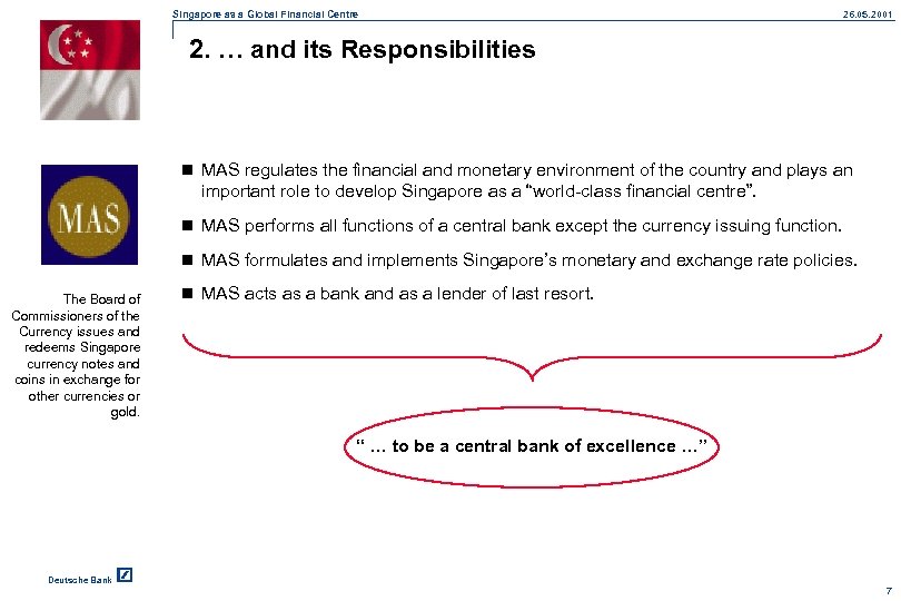 Singapore as a Global Financial Centre 26. 05. 2001 1. The Monetary Authority of Singapore … n The Financial Services Industry is regulated and controlled by the Mo. F through the MAS. n Established under the Monetary Authority of Singapore Act, 1970, MAS began its operations on 1 January 1971. http: //www. mas. gov. sg Deutsche Bank 6