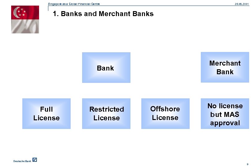 Singapore as a Global Financial Centre 26. 05. 2001 III. The Licensing Framework Deutsche Bank 8