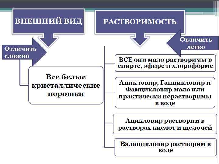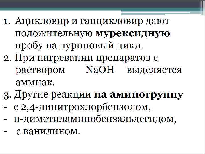 Идентификация 1. ИК – спектры; 2. УФ – спектры; ацикловир имеет: max при λ = 255 ± 2 нм min при λ = 227 ± 3 нм и плечо в области 270 - 290 нм 3. ТСХ 4. ВЭЖХ Количественное определение: ВЭЖХ (с СО)