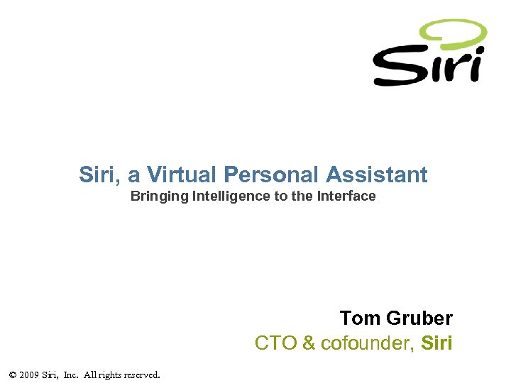 Siri, a Virtual Personal Assistant Bringing Intelligence to the Interface Tom Gruber CTO & cofounder, Siri © 2009 Siri, Inc. All rights reserved.