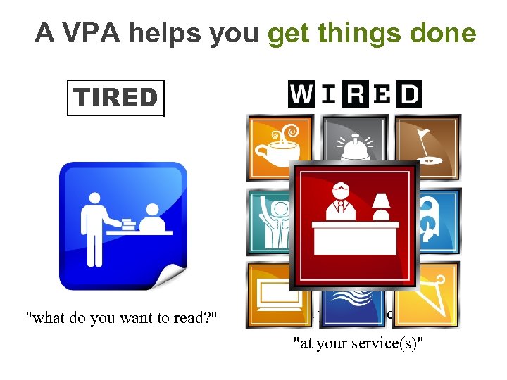 A VPA helps you get things done TIRED "what do you want to read? " "at your service(s)"