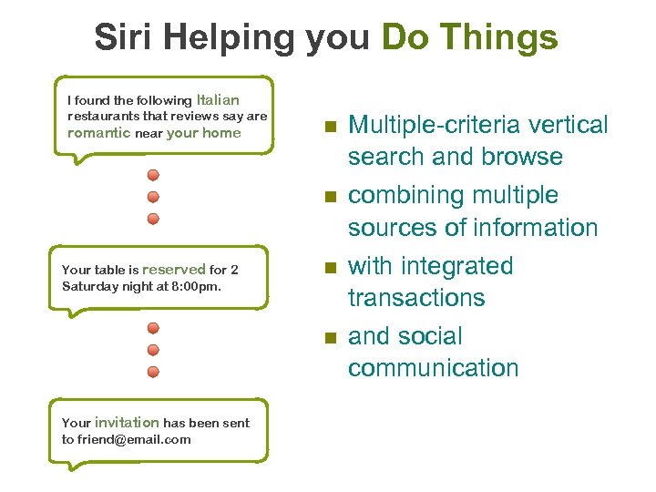 Siri Helping you Do Things I found the following Italian restaurants that reviews say are romantic near your home Multiple-criteria vertical search and browse n Your table is reserved for 2 Saturday night at 8: 00 pm. n combining multiple sources of information with integrated transactions and social communication n n Your invitation has been sent to friend@email. com