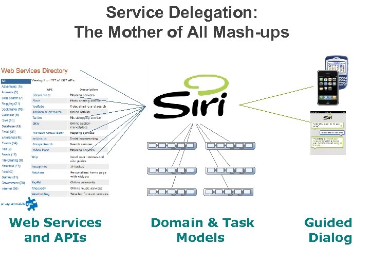 Service Delegation: The Mother of All Mash-ups Web Services and APIs Domain & Task Models Guided Dialog (c) 2009 Siri, Inc.
