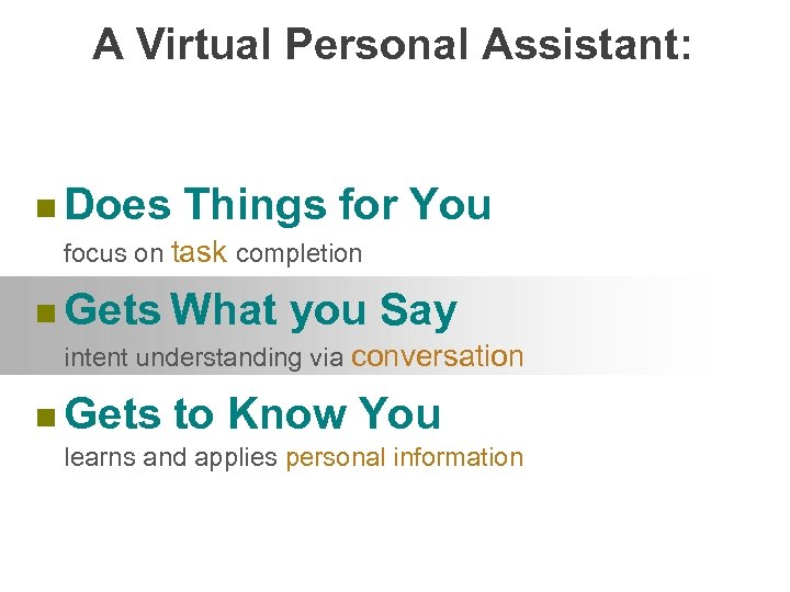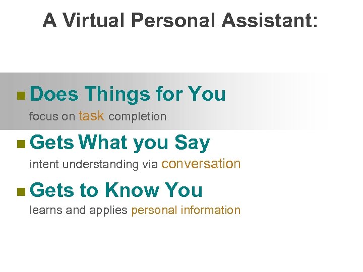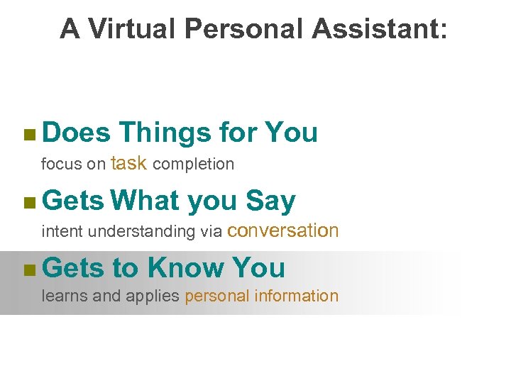 A Virtual Personal Assistant: n Does Things for focus on task completion n Gets What You you Say intent understanding via conversation n Gets to Know You learns and applies personal information