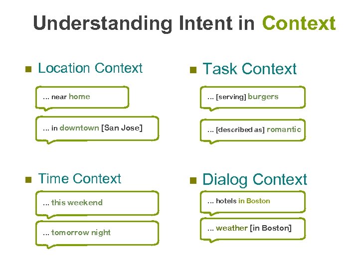 Understanding Intent in Context n Location Context n Task Context . . . near home . . . in downtown [San Jose] n . . . [serving] burgers . . . [described as] romantic Time Context. . . this weekend . . . tomorrow night n Dialog Context. . . hotels in Boston . . . weather [in Boston] (c) 2009 Siri, Inc.