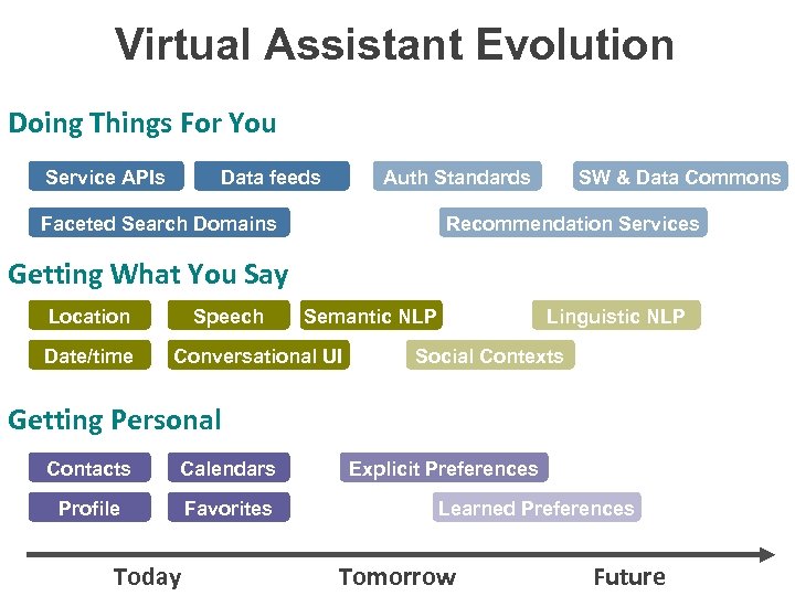 Virtual Assistant Evolution Doing Things For You Service APIs Data feeds Auth Standards Faceted Search Domains SW & Data Commons Recommendation Services Getting What You Say Location Date/time Speech Semantic NLP Conversational UI Linguistic NLP Social Contexts Getting Personal Contacts Calendars Profile Favorites Today Explicit Preferences Learned Preferences Tomorrow Future (c) 2009 Siri, Inc.