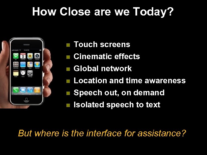 How Close are we Today? n Touch screens n Cinematic effects n Global network n Location and time awareness Speech out, on demand Isolated speech to text n n But where is the interface for assistance?