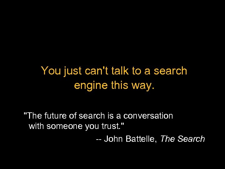 You just can't talk to a search engine this way. "The future of search is a conversation with someone you trust. " -- John Battelle, The Search