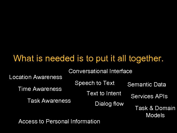 What is needed is to put it all together. Location Awareness Conversational Interface Time Awareness Task Awareness Speech to Text to Intent Dialog flow Access to Personal Information Semantic Data Services APIs Task & Domain Models