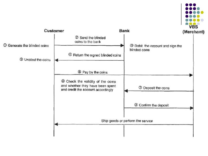 4. E-CASH l l l l User dan merchant memp wallet software User membuat coin Dengan metode blind signature coin disetujui oleh bank tanpa mengetahui nomor serinya dan mendebit account user. Ketika melakukan pembelian e-coin di kirimkan ke wallet software merchant kemudian merchant mendeposit e-coin Ketika coin di deposit, bank mengecek serial numbernya apakah sudah ada atau belum di database Jika belum ada transaksi disetujui dan account user di kredit Untuk maintenance database, coin mempunyai masa berlaku tertentu, jika sudah lewat coin tidak berlaku lagi.