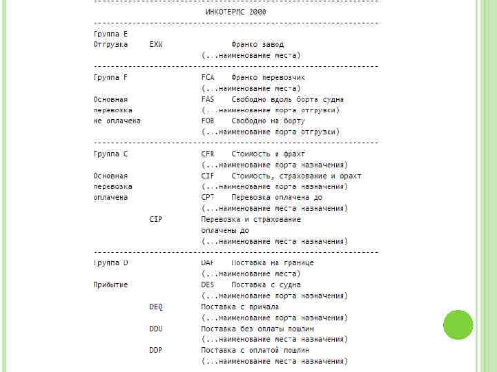 СТРУКТУРА ИНКОТЕРМС Для облегчения понимания в Инкотермс 1990 термины были сгруппированы в четыре категории, отличающиеся между собой по существу: начиная с термина, согласно которому продавец только предоставляет товар в распоряжение покупателя в своих помещениях (термин "E" - EX WORKS); далее идет вторая группа, в соответствии с которой продавец обязан передать товар указанному покупателем перевозчику (термины "F" FCA, FAS и FOB); далее термины "C", в соответствии с которыми продавец обязан заключить договор перевозки, но не принимая на себя риск утраты или повреждения товара или дополнительные затраты вследствие событий, произошедших после отгрузки и отправки (CFR, CIF, CPT и CIP); и, наконец, термины "D", при которых продавец должен нести все расходы и риски, необходимые для доставки товара до пункта назначения (DAF, DES, DEQ, DDU и. DDP).