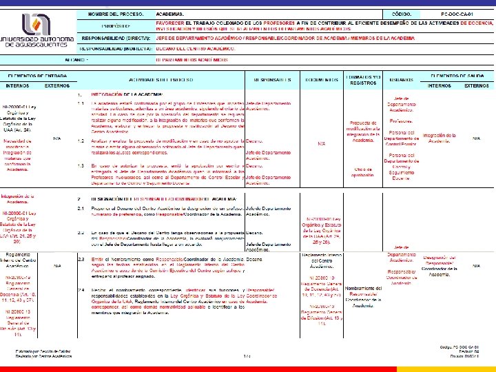 INSUMOS CONSIDERADOS PARA LA DEFINICIÓN Y DOCUMENTACIÓN DE LOS PROCESOS. • LEGISLACIÓN UNIVERSITARIA. (Ley Orgánica y Estatuto de la Ley Orgánica, Reglamentos Internos de los Centros Académicos, Reglamento General de Docencia, Reglamento de Personal Académico, entre otros). • DOCUMENTOS DE REFERENCIA ESTABLECIDOS POR LAS ÁREAS DE APOYO CENTRALES. (Proyecto Institucional de Tutoría (PIT), Orientaciones Básicas para el Diseño o Revisión de Programas de Materia, etc). • OBSERVACIONES EMITIDAS POR EL PERSONAL ACADÉMICO Y ADMINISTRATIVO DE LOS CENTROS ACADÉMICOS. • HALLAZGOS DE MEJORA DETECTADOS EN LAS EVALUACIONES REALIZADAS EN LAS AUDITORIAS INTERNAS Y EXTERNAS.