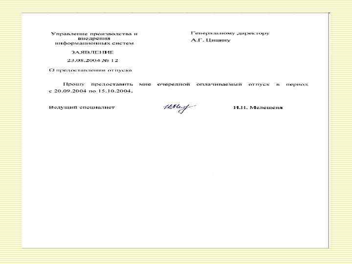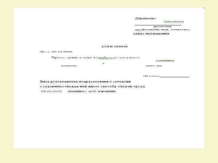 o o Приказ составляется в одном экземпляре и подписывается руководителем предприятия. В тексте указываются: фамилия, имя, отчество работника (полностью); наименование структурного подразделения; профессия (должность); условия приема на работу (характер работы). Графа «основание» приказа о приеме содержит дату и номер трудового договора. В графе «основание» приказа об увольнении указываются документы, послужившие причиной увольнения (заявление, объяснительная записка) и статья Трудового кодекса РФ, соответствующие причине увольнения. Приказы по личному составу, как правило, визируются юрисконсультом и должностным лицом, ответственным за работу с персоналом организации.