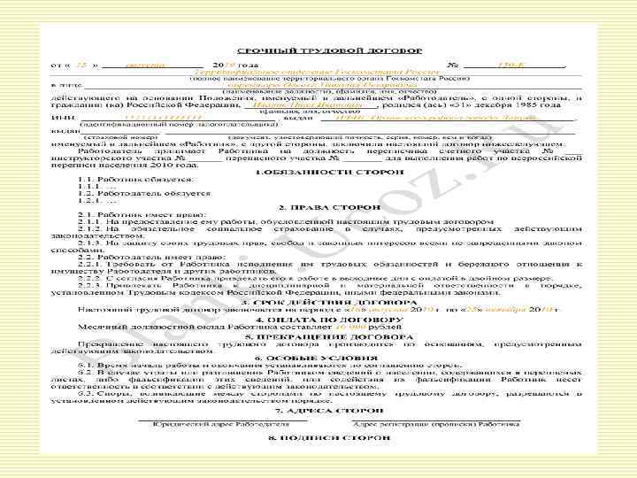 Трудовой договор В тексте трудового договора указывается: o - наименование работодателя; o - фамилия, имя, отчество работника; o - место работы; o - дата начала работы; o - наименование должности, специальности, профессии, конкретная трудовая функция; o - права и обязанности работника; o - права и обязанности работодателя; o - характеристики условий труда; o - компенсации и льготы работнику за работу в тяжелых, вредных или опасных условиях: режим труда и отдыха; o - условия оплаты труда; o - виды и условия социального страхования, непосредственно связанные с трудовой деятельностью.