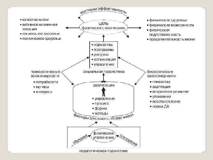 Все основные звенья педагогической подсистемы строятся на биологических закономерностях организма и потребностномотивационном отношении личности к занятиям физическими упражнениями. Педагогическая подсистема реализуется через социальную, звенья которой обеспечивают нормативное законодательство функционирования физического воспитания в общей государственной системе образования, а также право каждого члена общества на получение возможности использования средств физического воспитания в виде занятий в различных физкультурно оздоровительных группах по интересам, получение физкультурно-оздоровительных услуг, доступных каждому гражданину в зависимости от его трудовых доходов или бесплатно в свободное от учебы и работы время.