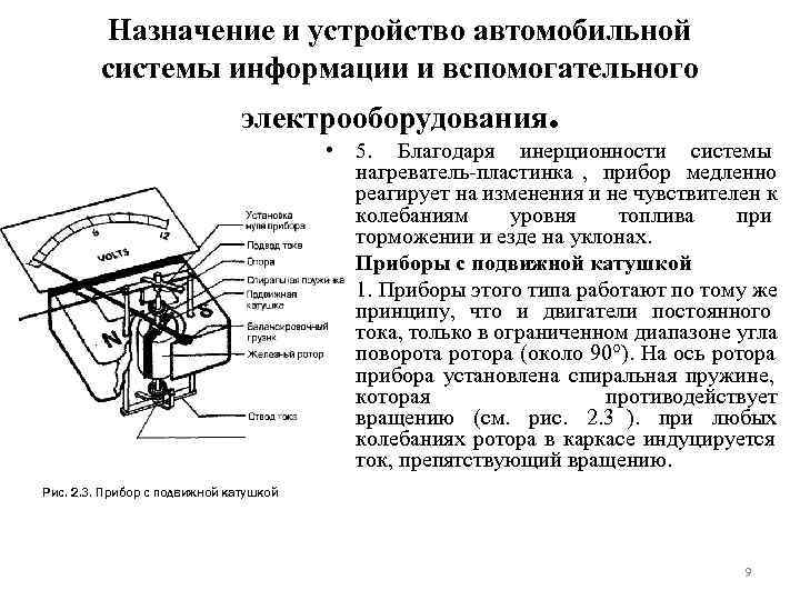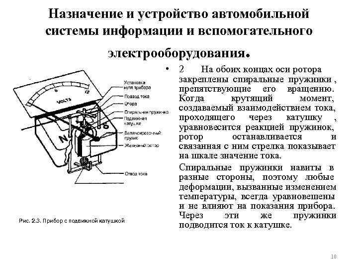 Назначение и устройство автомобильной системы информации и вспомогательного электрооборудования. • 2 На обоих концах оси ротора закреплены спиральные пружинки , препятствующие его вращению. Когда крутящий момент, создаваемый взаимодействием тока, проходящего через катушку , уравновесится реакцией пружинок, ротор останавливается и связанная с ним стрелка показывает на шкале значение тока. • Спиральные пружинки навиты в разные стороны, поэтому любые деформации, вызванные изменением температуры, всегда уравновешены и не влияют на показания прибора. Рис. 2. 3. Прибор с подвижной катушкой Через эти же пружинки подводится ток к катушке. 10