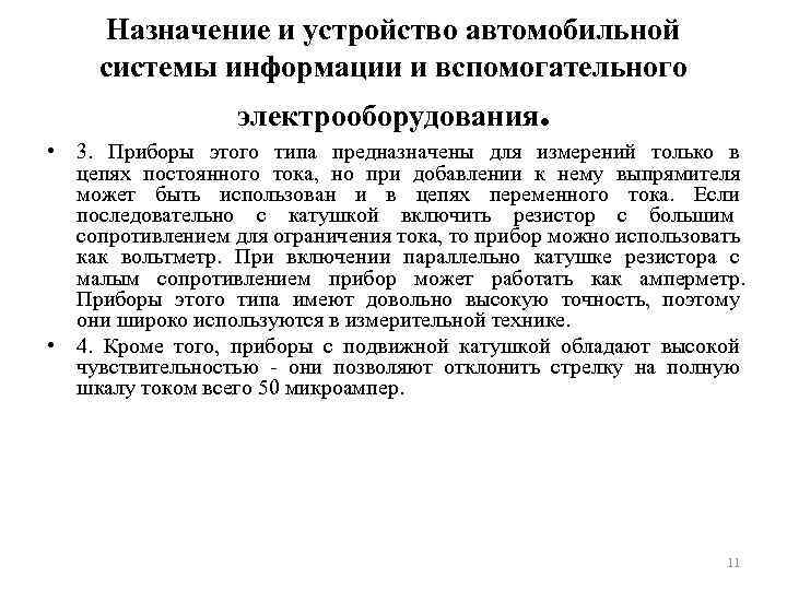 Назначение и устройство автомобильной системы информации и вспомогательного электрооборудования. • 3. Приборы этого типа предназначены для измерений только в цепях постоянного тока, но при добавлении к нему выпрямителя может быть использован и в цепях переменного тока. Если последовательно с катушкой включить резистор с большим сопротивлением для ограничения тока, то прибор можно использовать как вольтметр. При включении параллельно катушке резистора с малым сопротивлением прибор может работать как амперметр. Приборы этого типа имеют довольно высокую точность, поэтому они широко используются в измерительной технике. • 4. Кроме того, приборы с подвижной катушкой обладают высокой чувствительностью - они позволяют отклонить стрелку на полную шкалу током всего 50 микроампер. 11