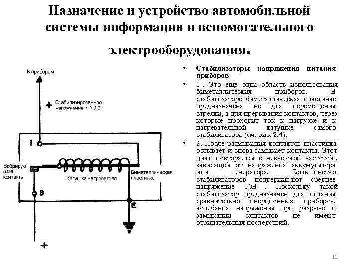Назначение и устройство автомобильной системы информации и вспомогательного электрооборудования. • Стабилизаторы напряжения питания приборов • 1. Это еще одна область использования биметаллических приборов. В стабилизаторе биметаллическая пластинке предназначена не для перемещения стрелки, а для прерывания контактов, через которые проходит ток к нагрузке и к нагревательной катушке самого стабилизатора (см. рис. 2. 4). • 2. После размыкания контактов пластинка остывает и снова замыкает контакты. Этот цикл повторяется с невысокой частотой , зависящей от напряжения аккумулятора или генератора. Большинство стабилизаторов поддерживают среднее напряжение 10 В. Поскольку такой стабилизатор предназначен для питания сравнительно инерционных приборов, колебания напряжения при разрыве и замыкании контактов не имеют отрицательных последствий. 12