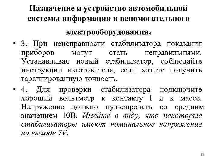Назначение и устройство автомобильной системы информации и вспомогательного электрооборудования. • 3. При неисправности стабилизатора показания приборов могут стать неправильными. Устанавливая новый стабилизатор, соблюдайте инструкции изготовителя, если хотите получить гарантированную точность. • 4. Для проверки стабилизатора подключите хороший вольтметр к контакту I и к массе. Напряжение должно пульсировать со средним значением 10 В. Имейте в виду, что некоторые стабилизаторы имеют номинальное напряжение на выходе 7 V. 13