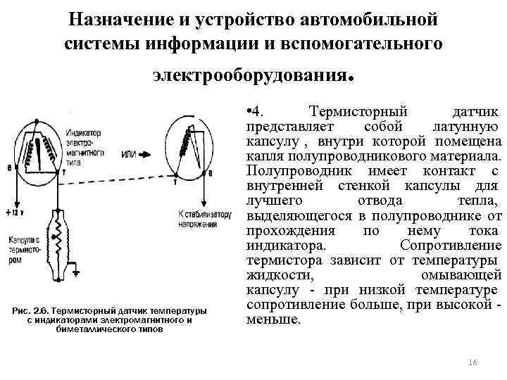 Назначение и устройство автомобильной системы информации и вспомогательного электрооборудования. 3. Термисторы (полупроводниковые) датчики температуры основаны на высокой чувствительности полупроводниковых приборов к изменению температуры. Полупроводники обладают ярко выраженной отрицательной зависимостью сопротивления от температуры. Иными словами, сопротивление полупроводнике, в отличие от большинства Рис. 2. 6. Термисторный датчик температуры металлов, с ростом температуры с индикаторами электромагнитного и уменьшается. биметаллического типов 15