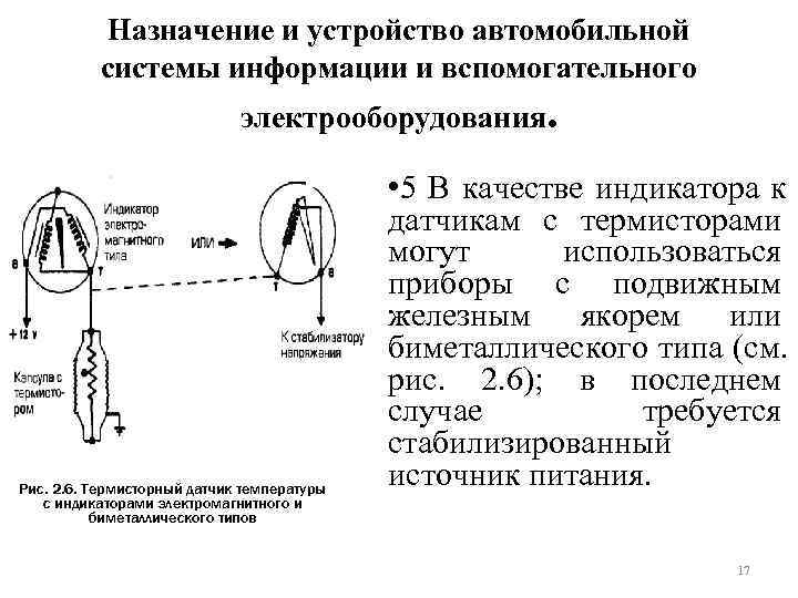 Назначение и устройство автомобильной системы информации и вспомогательного электрооборудования. • 5 В качестве индикатора к датчикам с термисторами могут использоваться приборы с подвижным железным якорем или биметаллического типа (см. рис. 2. 6); в последнем случае требуется стабилизированный Рис. 2. 6. Термисторный датчик температуры источник питания. с индикаторами электромагнитного и биметаллического типов 17