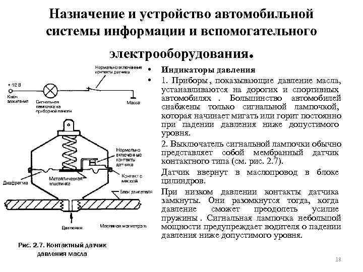 Назначение и устройство автомобильной системы информации и вспомогательного электрооборудования. • Индикаторы давления • 1. Приборы , показывающие давление масла, устанавливаются на дорогих и спортивных автомобилях. Большинство автомобилей снабжены только сигнальной лампочкой, которая начинает мигать или горит постоянно при падении давления ниже допустимого уровня. • 2. Выключатель сигнальной лампочки обычно представляет собой мембранный датчик контактного типа (см. рис. 2. 7). • Датчик ввернут в маслопровод в блоке цилиндров. • При низком давлении контакты датчика замкнуты. Они разомкнутся тогда, когда давление сможет преодолеть усилие пружины. Сигнальная лампочка небольшой мощности предупреждает водителя о падении давления ниже допустимого уровня. Рис. 2. 7. Контактный датчик давления масла 18