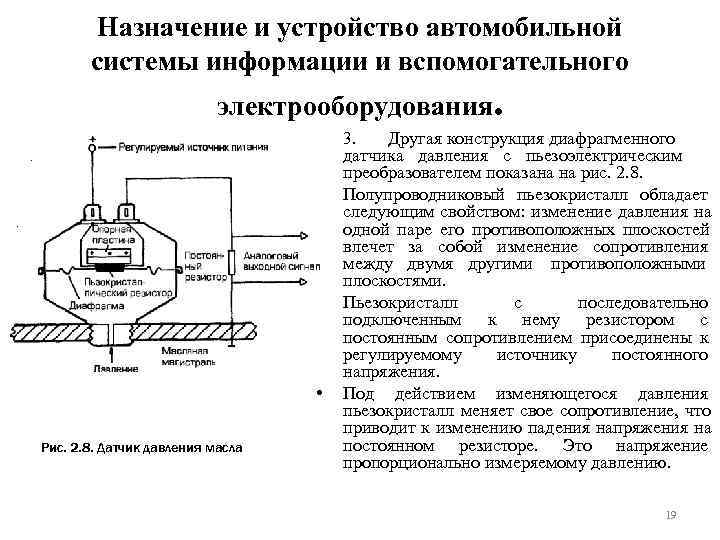 Назначение и устройство автомобильной системы информации и вспомогательного электрооборудования. • 3. Другая конструкция диафрагменного датчика давления с пьезоэлектрическим преобразователем показана на рис. 2. 8. • Полупроводниковый пьезокристалл обладает следующим свойством: изменение давления на одной паре его противоположных плоскостей влечет за собой изменение сопротивления между двумя другими противоположными плоскостями. • Пьезокристалл с последовательно подключенным к нему резистором с постоянным сопротивлением присоединены к регулируемому источнику постоянного напряжения. • Под действием изменяющегося давления пьезокристалл меняет свое сопротивление, что приводит к изменению падения напряжения на Рис. 2. 8. Датчик давления масла постоянном резисторе. Это напряжение пропорционально измеряемому давлению. 19
