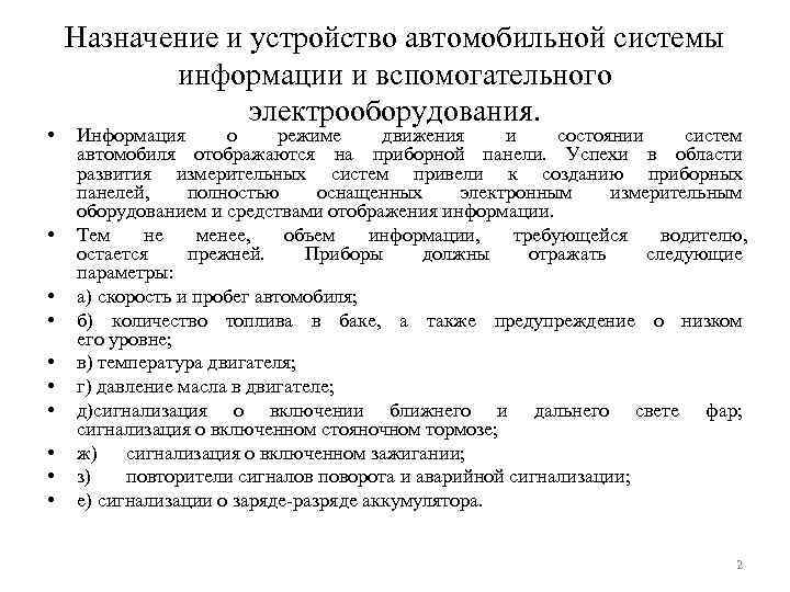 Назначение и устройство автомобильной системы информации и вспомогательного электрооборудования. • Информация о режиме движения и состоянии систем автомобиля отображаются на приборной панели. Успехи в области развития измерительных систем привели к созданию приборных панелей, полностью оснащенных электронным измерительным оборудованием и средствами отображения информации. • Тем не менее, объем информации, требующейся водителю, остается прежней. Приборы должны отражать следующие параметры: • а) скорость и пробег автомобиля; • б) количество топлива в баке, а также предупреждение о низком его уровне; • в) температура двигателя; • г) давление масла в двигателе; • д)сигнализация о включении ближнего и дальнего свете фар; сигнализация о включенном стояночном тормозе; • ж) сигнализация о включенном зажигании; • з) повторители сигналов поворота и аварийной сигнализации; • е) сигнализации о заряде-разряде аккумулятора. 2