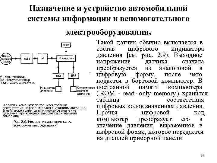 Назначение и устройство автомобильной системы информации и вспомогательного электрооборудования. • Такой датчик обычно включается в состав цифрового индикатора давления [см. рис. 2. 9). Выходное напряжение датчика сначала преобразуется из аналоговой в цифровую форму, после чего подается в бортовой компьютер. В постоянной памяти компьютера ( ROM - read - only memory ) хранится таблица соответствия В памяти компьютера хранится таблица соответствия цифровых кодов значениям давления. В ней также хранится минимальное значение давления, при котором загорается сигнальная лампочка. Прочтя цифровой код, Рис. 2. 9. Измерение давления масла компьютер преобразует его в электронными средствами значение давления, выраженное в цифровой форме, которое передается на дисплей приборной панели. 20