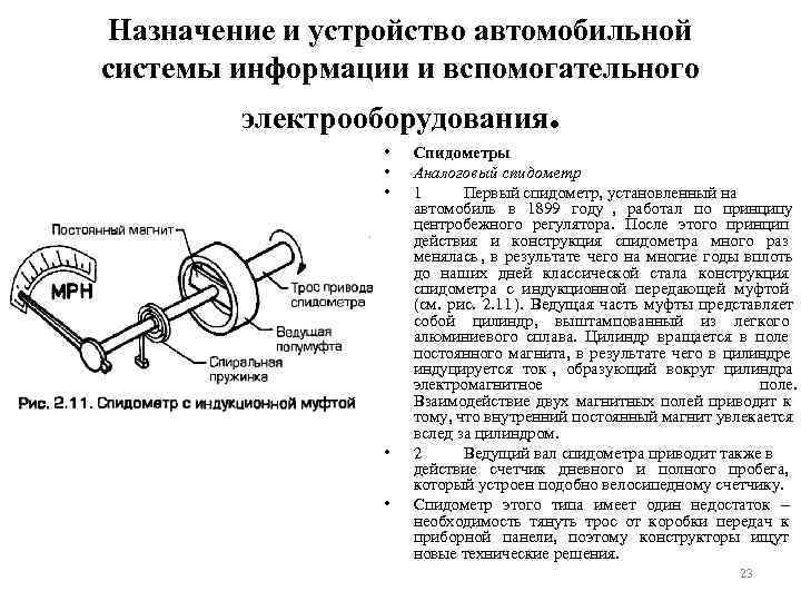Назначение и устройство автомобильной системы информации и вспомогательного электрооборудования. • Спидометры • Аналоговый спидометр • 1 Первый спидометр, установленный на автомобиль в 1899 году , работал по принципу центробежного регулятора. После этого принцип действия и конструкция спидометра много раз менялась , в результате чего на многие годы вплоть до наших дней классической стала конструкция спидометра с индукционной передающей муфтой (см. рис. 2. 11 ). Ведущая часть муфты представляет собой цилиндр, выштампованный из легкого алюминиевого сплава. Цилиндр вращается в поле постоянного магнита, в результате чего в цилиндре индуцируется ток , образующий вокруг цилиндра электромагнитное поле. Взаимодействие двух магнитных полей приводит к тому, что внутренний постоянный магнит увлекается вслед за цилиндром. • 2 Ведущий вал спидометра приводит также в действие счетчик дневного и полного пробега, который устроен подобно велосипедному счетчику. • Спидометр этого типа имеет один недостаток – необходимость тянуть трос от коробки передач к приборной панели, поэтому конструкторы ищут новые технические решения. 23