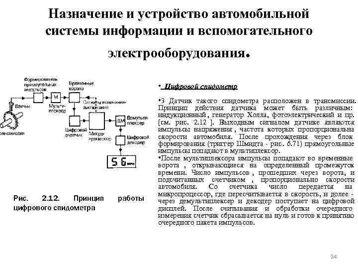 Назначение и устройство автомобильной системы информации и вспомогательного электрооборудования. • Цифровой спидометр • 3 Датчик такого спидометра расположен в трансмиссии. Принцип действия датчика может быть различным: индукционный , генератор Холла, фотоэлектрический и пр. [см. рис. 2. 12 ]. Выходным сигналом датчике являются импульсы напряжения , частота которых пропорциональна скорости автомобиля. После прохождения через блок формирования (триггер Шмидта - рис. 6. 71) прямоугольные импульсы попадают в мультиплексор. • После мультиплексора импульсы попадают во временные ворота , открывающиеся на определенный промежуток времени. Число импульсов , прошедших через ворота, и подсчитанных счетчиком , пропорционально скорости автомобиля. Со счетчика число передается на микропроцессор, где пересчитывается в скорость, и долее - Рис. 2. 12. Принцип работы через демультиплексер и декодер поступает на цифровой цифрового спидометра дисплей. После считывания и обработки очередного измерения счетчик сбрасывается на нуль и готов к принятию очередного пакета импульсов. 24