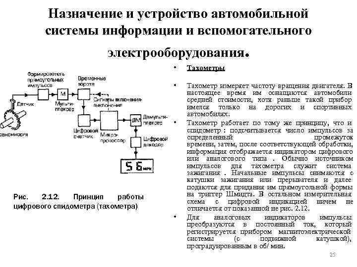 Назначение и устройство автомобильной системы информации и вспомогательного электрооборудования. • Тахометры • Тахометр измеряет частоту вращения двигателя. В настоящее время им оснащаются автомобили средней стоимости, хотя раньше такой прибор имелся только на дорогих и спортивных автомобилях. • Тахометр работает по тому же принципу, что и спидометр : подсчитывается число импульсов за определенный промежуток времени, затем, после соответствующей обработки, информация отображается индикатором цифрового или аналогового типа. Обычно источником импульсов для тахометра служит система зажигания. Начальные импульсы снимаются с катушки зажигания или прерывателя и далее подаются для придания им прямоугольной формы Рис. 2. 12. Принцип работы на триггер Шмидта. В остальном измерительная схема с цифровой индикацией ничем не цифрового спидометра (тахометра) отличается от показанной не рис. 2. 12. • Для аналоговых индикаторов импульсы преобразуются в постоянный ток, который регистрируется прибором магнитоэлектрической системы (с подвижной катушкой), проградуированным в об/ мин. 25