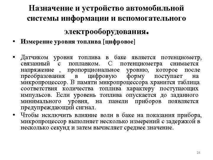 Назначение и устройство автомобильной системы информации и вспомогательного электрооборудования. • Измерение уровня топлива [цифровое] • Датчиком уровня топлива в баке является потенциометр, связанный с поплавком. С потенциометра снимается напряжение , пропорциональное уровню, которое после преобразования в цифровую форму поступает на микропроцессор. В памяти микропроцессора хранится таблица соответствия количества топлива характеру поступающих импульсов. Если уровень топлива опускается до заданного минимального уровня, на панели приборов появляется предупреждающий сигнал. • Чтобы исключить влияние волн в баке на показания прибора, микропроцессор выполняет несколько измерений с задержкой в несколько секунд и затем вычисляет среднее значение. 28