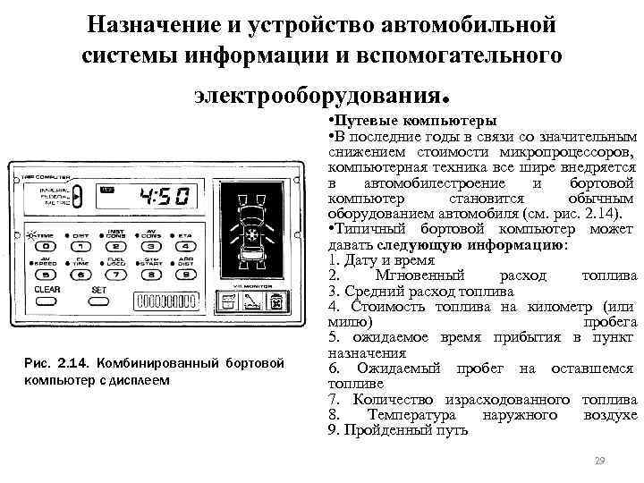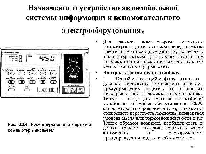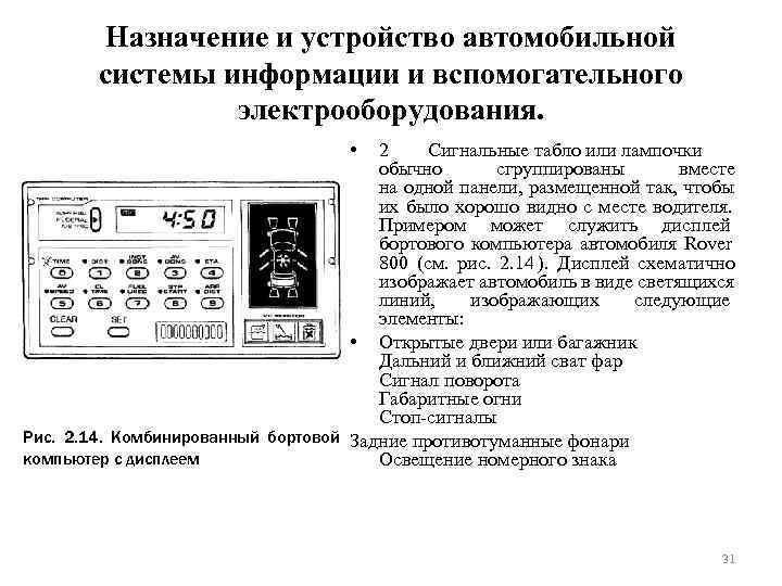 Назначение и устройство автомобильной системы информации и вспомогательного электрооборудования. • Для расчета компьютером некоторых параметров водитель должен перед выездом ввести в него исходные данные, после чего компьютер сможет давать указанную выше информацию при нажатии соответствующей кнопки на пульте управления. • Контроль состояния автомобиля • 1 Одной из функций информационного дисплея бортового компьютера является предупреждение водителя о возникших неисправностях и ненормальных ситуациях. Теперь , когда для многих автомобилей установлен интервал обслуживания 12000 миль, возросла вероятность того, что за этот срок может перегореть лампочка, понизиться уровень масла или тормозной жидкости и т. д. Рис. 2. 14. Комбинированный бортовой Таким образом возникла необходимость в компьютер с дисплеем дополнительном контроле состояния узлов автомобиля и своевременном предупреждении водителя об их отказах. 30