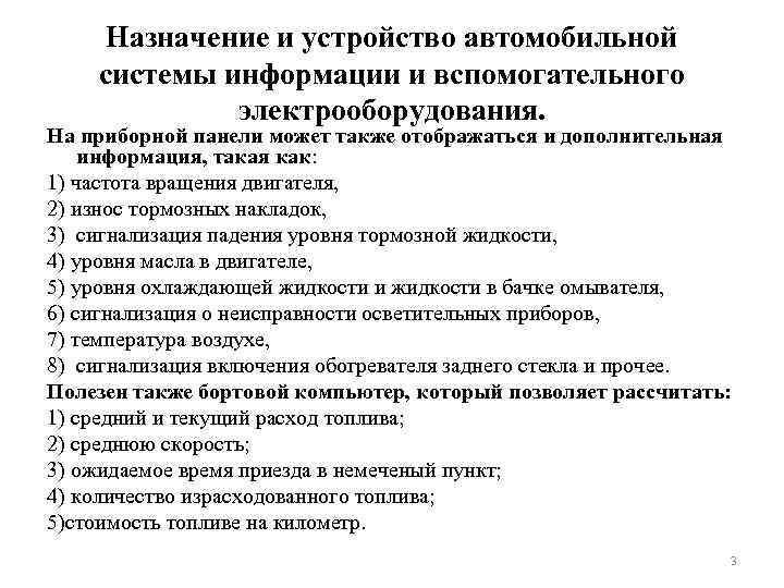 Назначение и устройство автомобильной системы информации и вспомогательного электрооборудования. На приборной панели может также отображаться и дополнительная информация, такая как: 1) частота вращения двигателя, 2) износ тормозных накладок, 3) сигнализация падения уровня тормозной жидкости, 4) уровня масла в двигателе, 5) уровня охлаждающей жидкости и жидкости в бачке омывателя, 6) сигнализация о неисправности осветительных приборов, 7) температура воздухе, 8) сигнализация включения обогревателя заднего стекла и прочее. Полезен также бортовой компьютер, который позволяет рассчитать: 1) средний и текущий расход топлива; 2) среднюю скорость; 3) ожидаемое время приезда в немеченый пункт; 4) количество израсходованного топлива; 5)стоимость топливе на километр. 3