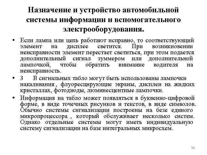 Назначение и устройство автомобильной системы информации и вспомогательного электрооборудования. • Если лампа или цепь работают исправно, то соответствующий элемент на дисплее светится. При возникновении неисправности элемент перестает светиться, при этом подается дополнительный сигнал зуммером или дополнительной лампочкой, чтобы обратить внимание водителя на неисправность. • 3 В сигнальных табло могут быть использованы лампочки накаливания , флуоресцирующие экраны, дисплеи на жидких кристаллах, фотодиоды, люминесцентные лампочки. • Информация на табло может появляться в буквенно-цифровой форме, в виде точечных рисунков и текстов, в виде символов. Обычно системы сигнализации построены на безе единого микропроцессора , который обслуживает несколько систем. Однако отдельные системы могут иметь индивидуальную систему сигнализации на базе интегральных микросхем. 32