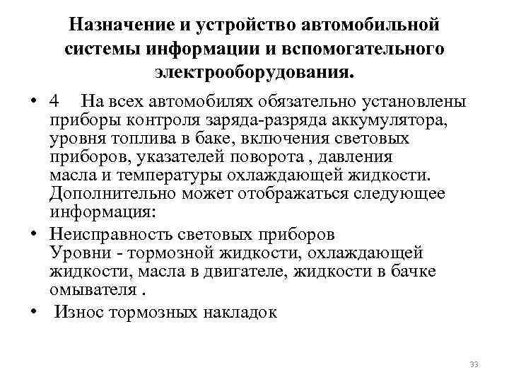 Назначение и устройство автомобильной системы информации и вспомогательного электрооборудования. • 4 На всех автомобилях обязательно установлены приборы контроля заряда-разряда аккумулятора, уровня топлива в баке, включения световых приборов, указателей поворота , давления масла и температуры охлаждающей жидкости. Дополнительно может отображаться следующее информация: • Неисправность световых приборов Уровни - тормозной жидкости, охлаждающей жидкости, масла в двигателе, жидкости в бачке омывателя. • Износ тормозных накладок 33