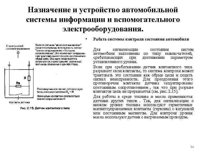 Назначение и устройство автомобильной системы информации и вспомогательного электрооборудования. • Рабата системы контроля состояния автомобиля • Для сигнализации состояния систем автомобиля выполнены по типу выключателей, срабатывающих при достижении параметром установленного уровня. • Если при срабатывании датчик контактного типа разрывает свои контакты, то система контроля может трактовать это состояние как обрыв цепи и подать сигнал неисправности. Для преодоления этого противоречия контакты датчика зашунтированы постоянным сопротивлением , так что при разрыве контактов цепь не прерывается (см. рис. 2. 15]. • Для работы в среде топлива и масла применяются датчики других типов. Так, для сигнализации о низком уровне топлива используют герметичные магнитоуправляемые контакты (герконы) с катушкой или постоянным магнитом. Для контроля уровня масла используют датчик с нагреваемым проводом. 34