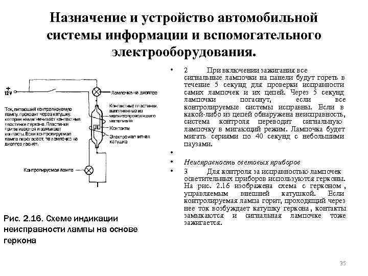 Назначение и устройство автомобильной системы информации и вспомогательного электрооборудования. • 2 При включении зажигания все сигнальные лампочки на панели будут гореть в течение 5 секунд для проверки исправности самих лампочек и их цепей. Через 5 секунд лампочки погаснут, если все контролируемые системы исправны. Если в какой-либо из цепей обнаружена неисправность, система контроля переводит сигнальную лампочку в мигающий режим. Лампочка будет мигать сериями по 40 секунд с небольшими паузами. • Неисправность световых приборов • 3 Для контроля за исправностью лампочек осветительных приборов используются герконы. На рис. 2. 16 изображена схема с герконом , управляемым внешней катушкой. Если контролируемая лампа горит, проходящий через нее ток возбуждает катушку геркона , контакты Рис. 2. 16. Схеме индикации замыкаются и сигнальная лампочке тоже зажигается. неисправности лампы на основе геркона 35
