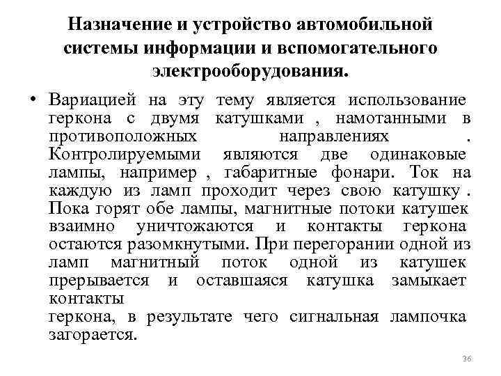 Назначение и устройство автомобильной системы информации и вспомогательного электрооборудования. • Вариацией на эту тему является использование геркона с двумя катушками , намотанными в противоположных направлениях . Контролируемыми являются две одинаковые лампы, например , габаритные фонари. Ток на каждую из ламп проходит через свою катушку. Пока горят обе лампы, магнитные потоки катушек взаимно уничтожаются и контакты геркона остаются разомкнутыми. При перегорании одной из ламп магнитный поток одной из катушек прерывается и оставшаяся катушка замыкает контакты геркона, в результате чего сигнальная лампочка загорается. 36