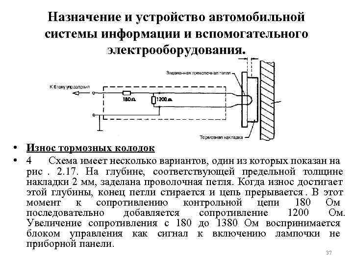 Назначение и устройство автомобильной системы информации и вспомогательного электрооборудования. • Износ тормозных колодок • 4 Схема имеет несколько вариантов, один из которых показан на рис. 2. 17. На глубине, соответствующей предельной толщине накладки 2 мм, заделана проволочная петля. Когда износ достигает этой глубины, конец петли стирается и цепь прерывается. В этот момент к сопротивлению контрольной цепи 180 Ом последовательно добавляется сопротивление 1200 Ом. Увеличение сопротивления с 180 до 1380 Ом воспринимается блоком управления как сигнал к включению лампочки не приборной панели. 37