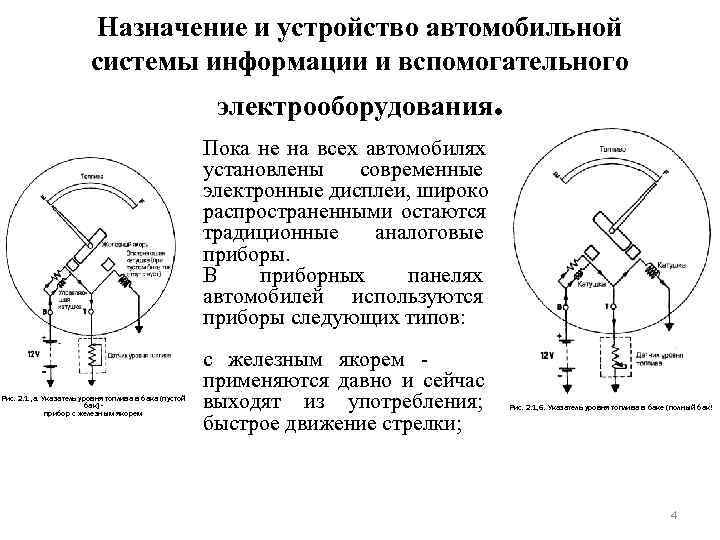 Назначение и устройство автомобильной системы информации и вспомогательного электрооборудования. Пока не на всех автомобилях установлены современные электронные дисплеи, широко распространенными остаются традиционные аналоговые приборы. В приборных панелях автомобилей используются приборы следующих типов: с железным якорем - применяются давно и сейчас Рис. 2. 1 , а. Указатель уровня топлива в бака (пустой бак] - прибор с железным якорем выходят из употребления; Рис. 2. 1, 6. Указатель уровня топлива в баке (полный бак! быстрое движение стрелки; 4