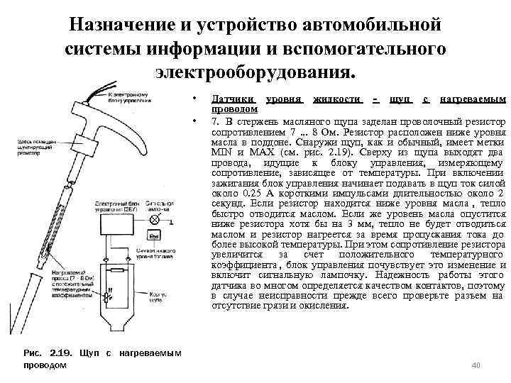 Назначение и устройство автомобильной системы информации и вспомогательного электрооборудования. • Датчики уровня жидкости - емкостной датчик • 6 В стенку бачка охлаждающей жидкости заделаны два не изолированных металлических электрода, образующих обкладки конденсаторе. К обкладкам подведен переменный ток очень невысокого напряжения, но высокой частоты. Пока контакты погружены в жидкость, сопротивление конденсатора велико, но стоит жидкости опуститься ниже уровня заделки электродов, как сопротивление резко падает в связи с тем, что диэлектрическая проницаемость воздуха выше, чем жидкости. Уменьшение сопротивления конденсатора блок управления воспринимает как сигнал к включению лампочки на приборной панели. Рис. 2. 19. Щуп с нагреваемым проводом 39