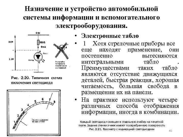 Назначение и устройство автомобильной системы информации и вспомогательного электрооборудования. • Электронные табло • 1 Хотя стрелочные приборы все еще находят применение, они постепенно вытесняются интегральными табло . Преимуществами таких табло являются отсутствие движущихся Рис. 2. 20. Типичная схема включения светодиода деталей, быстрая реакция, хорошая читаемость, большая свобода в размещении их на панели. • На практике используют четыре различных способа отображения информации, иногда в комбинации. Каждый светодиод помещен в отдельную ячейку на печатной плате. Задние стенки ячеек имеют посеребренную поверхность Рис. 2. 21. Тахометр с индикацией светодиодами 41
