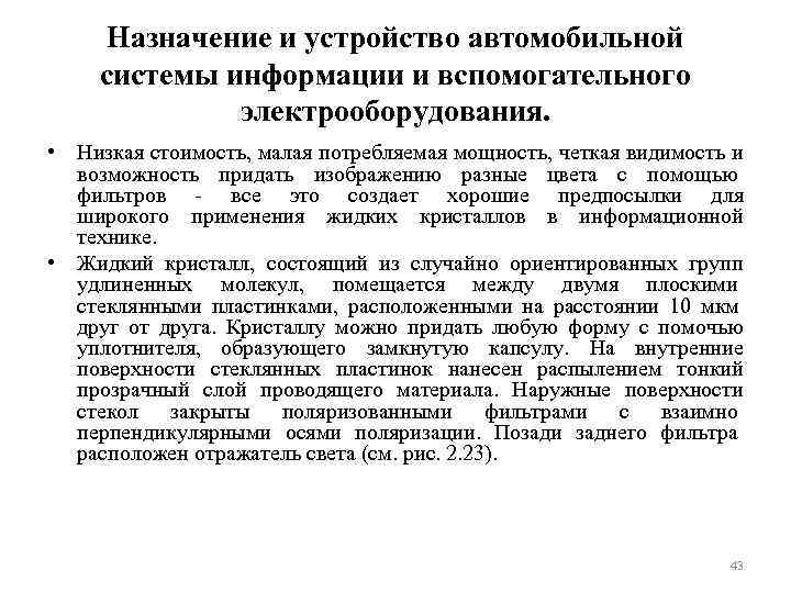 Назначение и устройство автомобильной системы информации и вспомогательного электрооборудования. • Низкая стоимость, малая потребляемая мощность, четкая видимость и возможность придать изображению разные цвета с помощью фильтров - все это создает хорошие предпосылки для широкого применения жидких кристаллов в информационной технике. • Жидкий кристалл, состоящий из случайно ориентированных групп удлиненных молекул, помещается между двумя плоскими стеклянными пластинками, расположенными на расстоянии 10 мкм друг от друга. Кристаллу можно придать любую форму с помочью уплотнителя, образующего замкнутую капсулу. На внутренние поверхности стеклянных пластинок нанесен распылением тонкий прозрачный слой проводящего материала. Наружные поверхности стекол закрыты поляризованными фильтрами с взаимно перпендикулярными осями поляризации. Позади заднего фильтра расположен отражатель света (см. рис. 2. 23). 43