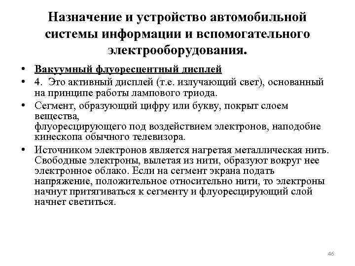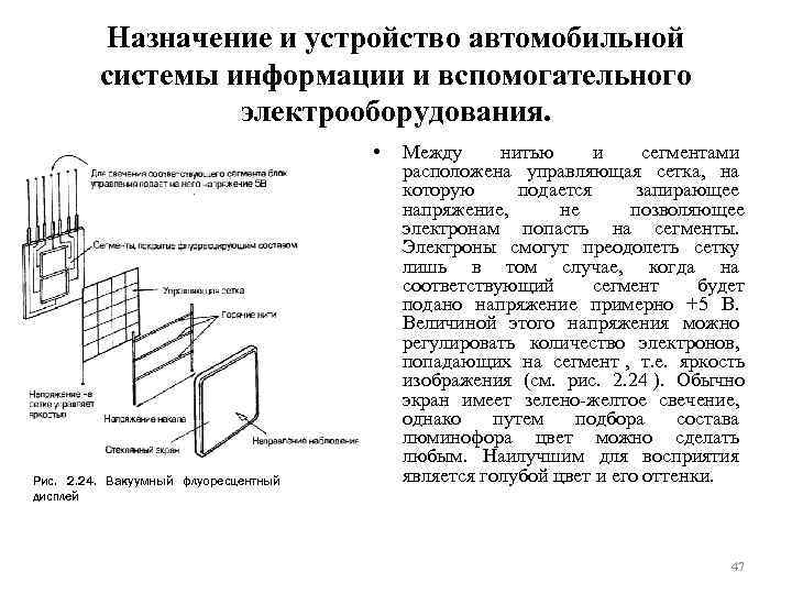 Назначение и устройство автомобильной системы информации и вспомогательного электрооборудования. • Вакуумный флуоресцентный дисплей • 4. Это активный дисплей (т. е. излучающий свет), основанный на принципе работы лампового триода. • Сегмент, образующий цифру или букву, покрыт слоем вещества, флуоресцирующего под воздействием электронов, наподобие кинескопа обычного телевизора. • Источником электронов является нагретая металлическая нить. Свободные электроны, вылетая из нити, образуют вокруг нее электронное облако. Если на сегмент экрана подать напряжение, положительное относительно нити, то электроны начнут притягиваться к сегменту и флуоресцирующий слой начнет светиться. 46