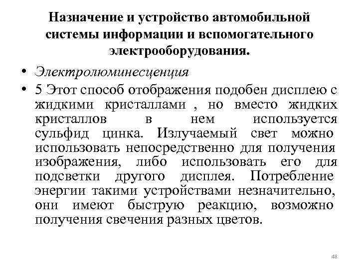 Назначение и устройство автомобильной системы информации и вспомогательного электрооборудования. • Электролюминесценция • 5 Этот способ отображения подобен дисплею с жидкими кристаллами , но вместо жидких кристаллов в нем используется сульфид цинка. Излучаемый свет можно использовать непосредственно для получения изображения, либо использовать его для подсветки другого дисплея. Потребление энергии такими устройствами незначительно, они имеют быструю реакцию, возможно получения свечения разных цветов. 48