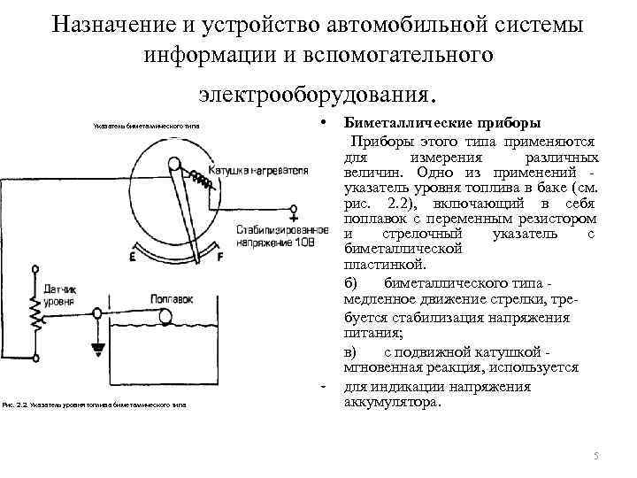 Назначение и устройство автомобильной системы информации и вспомогательного электрооборудования. Указатель биметаллического типа • Биметаллические приборы • Приборы этого типа применяются для измерения различных величин. Одно из применений - указатель уровня топлива в баке (см. рис. 2. 2), включающий в себя поплавок с переменным резистором и стрелочный указатель с биметаллической пластинкой. • б) биметаллического типа - медленное движение стрелки, тре- • буется стабилизация напряжения питания; • в) с подвижной катушкой - мгновенная реакция, используется • для индикации напряжения Рис. 2. 2. Указатель уровня топлива биметаллического типа аккумулятора. 5
